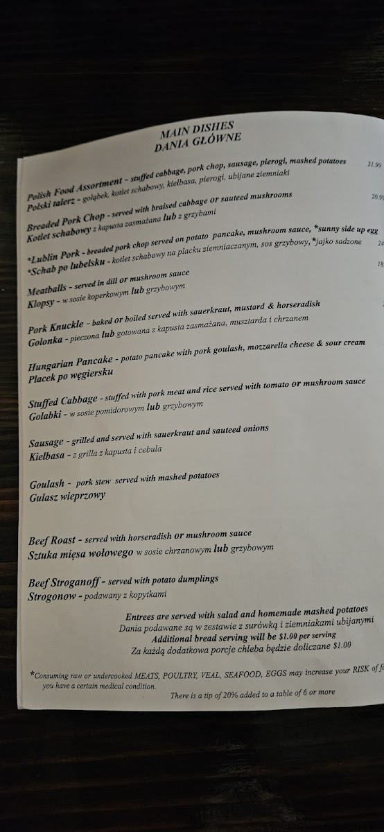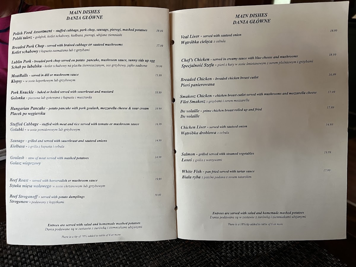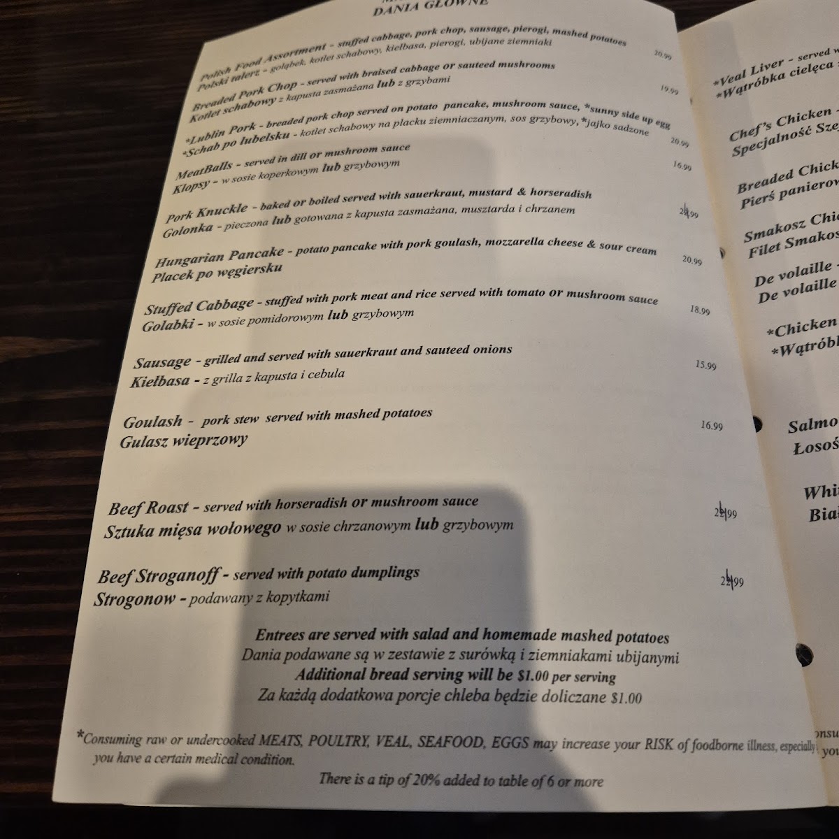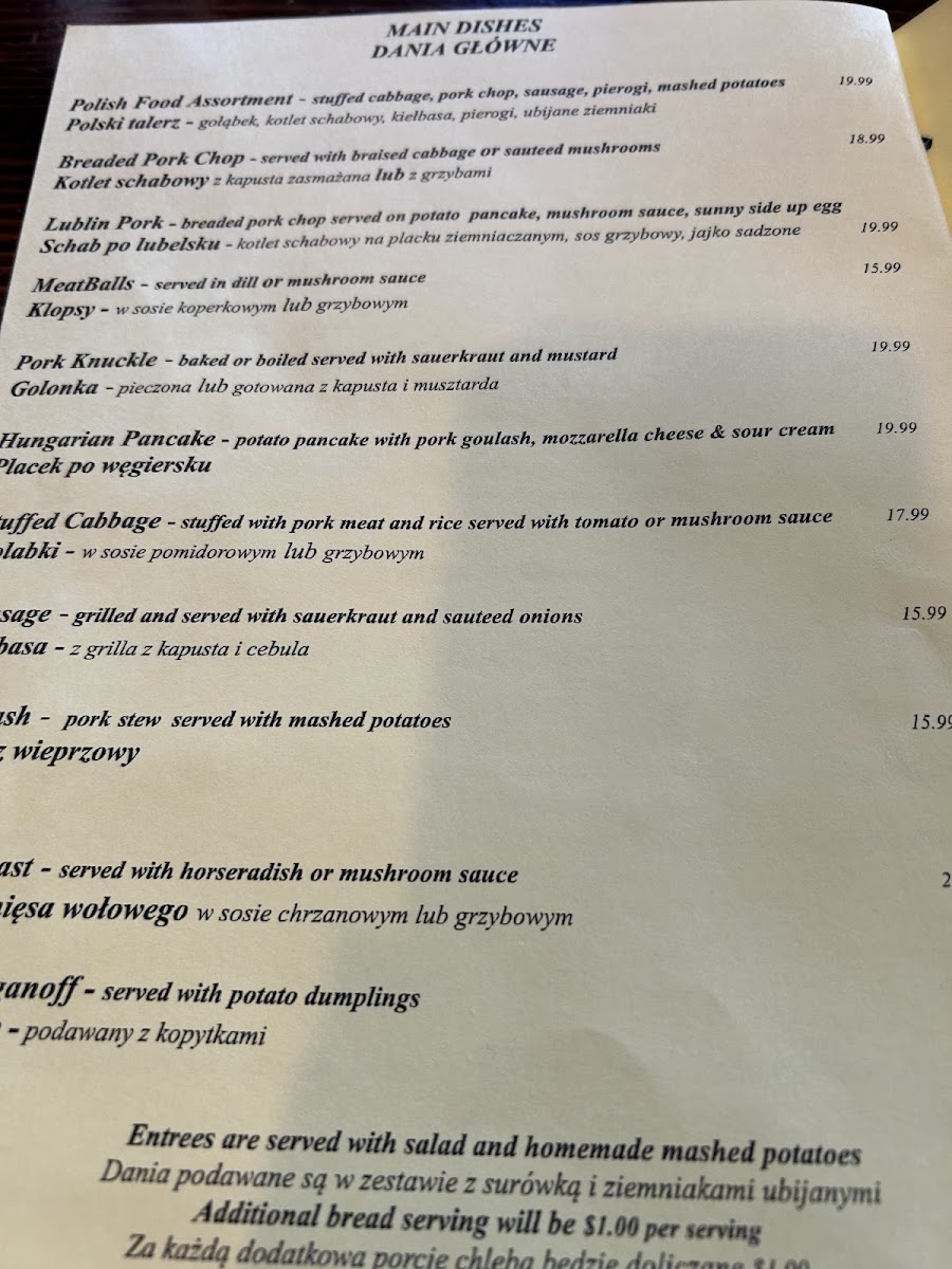 Stuffed cabbage, pork chop, sausage, pierogi, mashed potatoes.